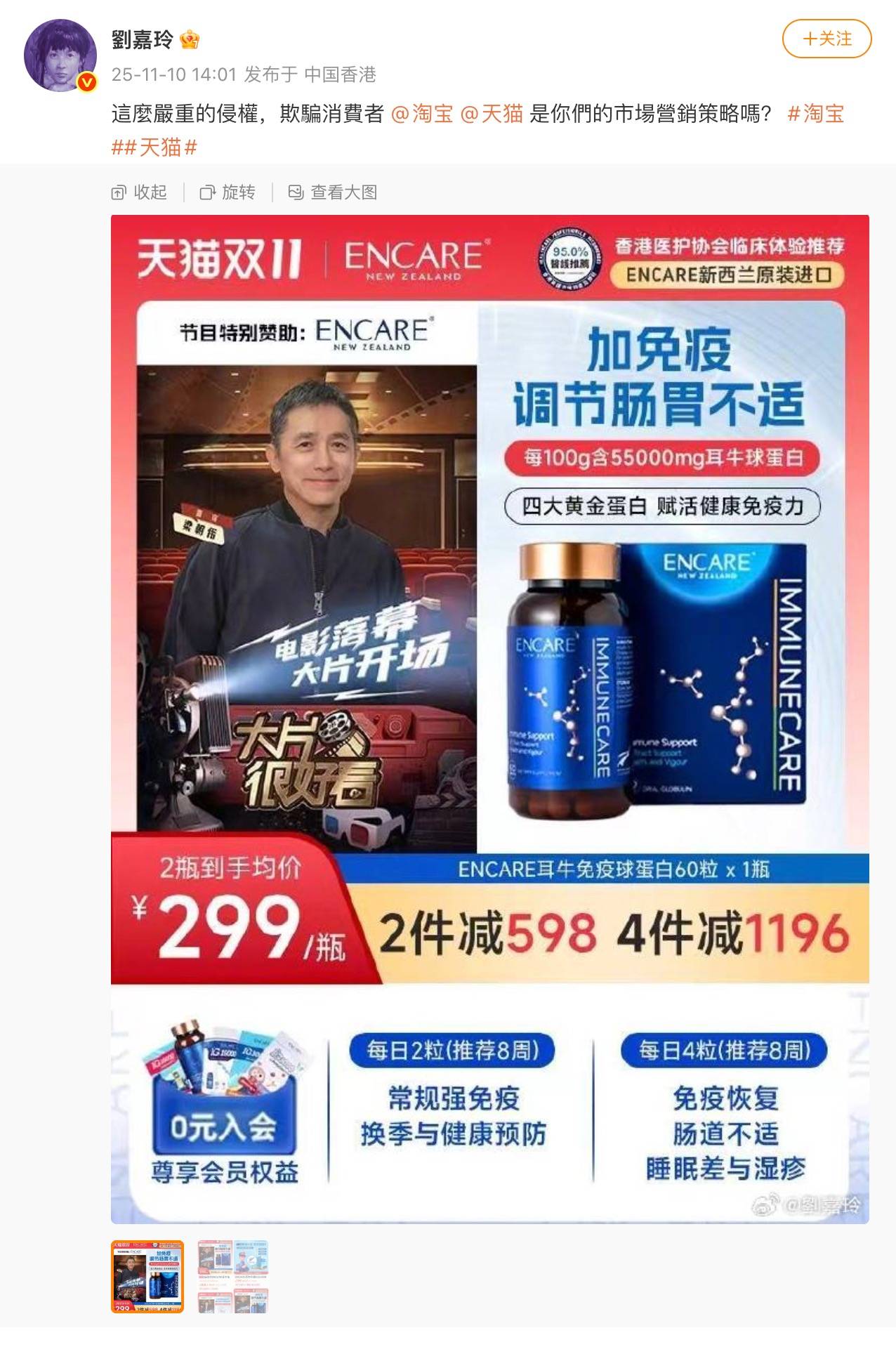 知名演员刘嘉玲昨日在微博发文,公开质疑淘宝与天猫平台存在严重侵权与消费者欺骗行为。
