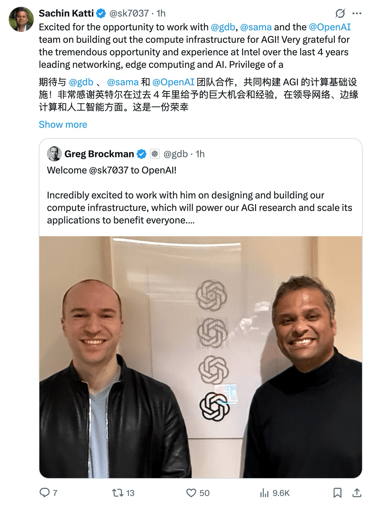 英特尔首席技术与人工智能官萨钦・卡蒂(Sachin Katti)已确认离职,加入 OpenAI,负责构建支持通用人工智能(AGI)的计算基础设施。