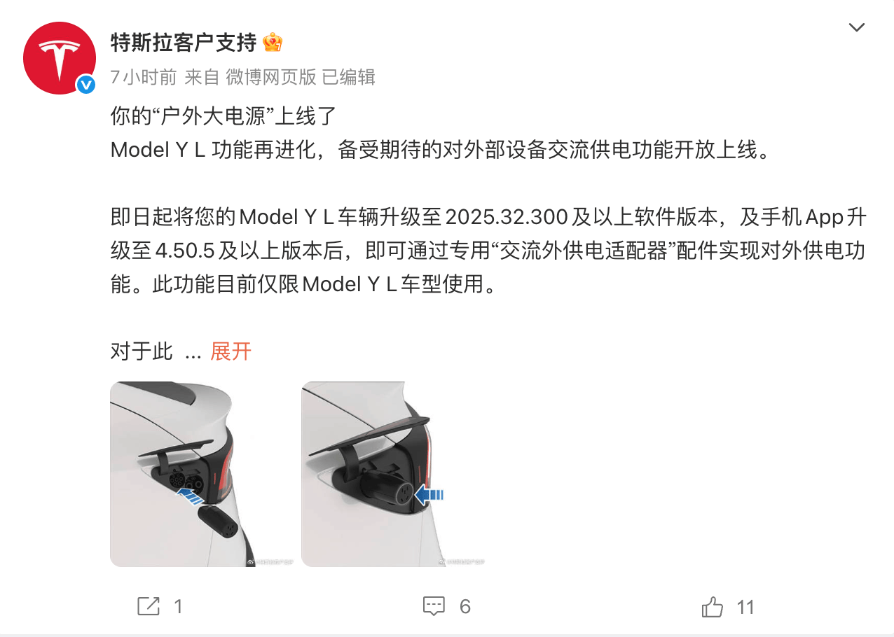 昨天,特斯拉客户支持在微博宣布,旗下 Model Y L 车型正式上线L)功能。