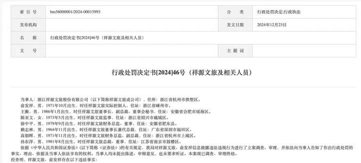 根据官方发布的《行政处罚事先告知书》显示:祥源文旅实际控制人俞发祥被罚300万元,公司被罚200万元,时任董事长王衡、时任监事陈亚文、时任财务总监徐中平等多名高管一同受到处罚,被罚金额为60万至90万元不等。