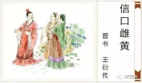 魏正始中,何晏、王弼等祖述老庄,立论以为:「天地万物皆以无为本。无也者,开物成务,无往不存者也。阴阳恃以化生,万物恃以成形,贤者恃以成德,不肖恃以免身。故无之为用,无爵而贵矣。」衍甚重之。惟裴頠以为非,着论以讥之,而衍处之自若。衍既有盛才美貌,明悟若神,常自比子贡。兼声名藉甚,倾动当世。妙善玄言,唯谈老庄为事。每捉玉柄麈尾,与手同色。义理有所不安,随即改更,世号「口中雌黄」。朝野翕然,谓之「一世龙门」矣。累居显职,后进之士,莫不景慕放效。选举登朝,皆以为称首。矜高浮诞,遂成风俗焉。衍尝丧幼子,山简吊之。衍悲不自胜,简曰:「孩抱中物,何至于此!」衍曰:「圣人忘情,最下不及于情。然则情之所钟,正在我辈。」简服其言,更为之恸。