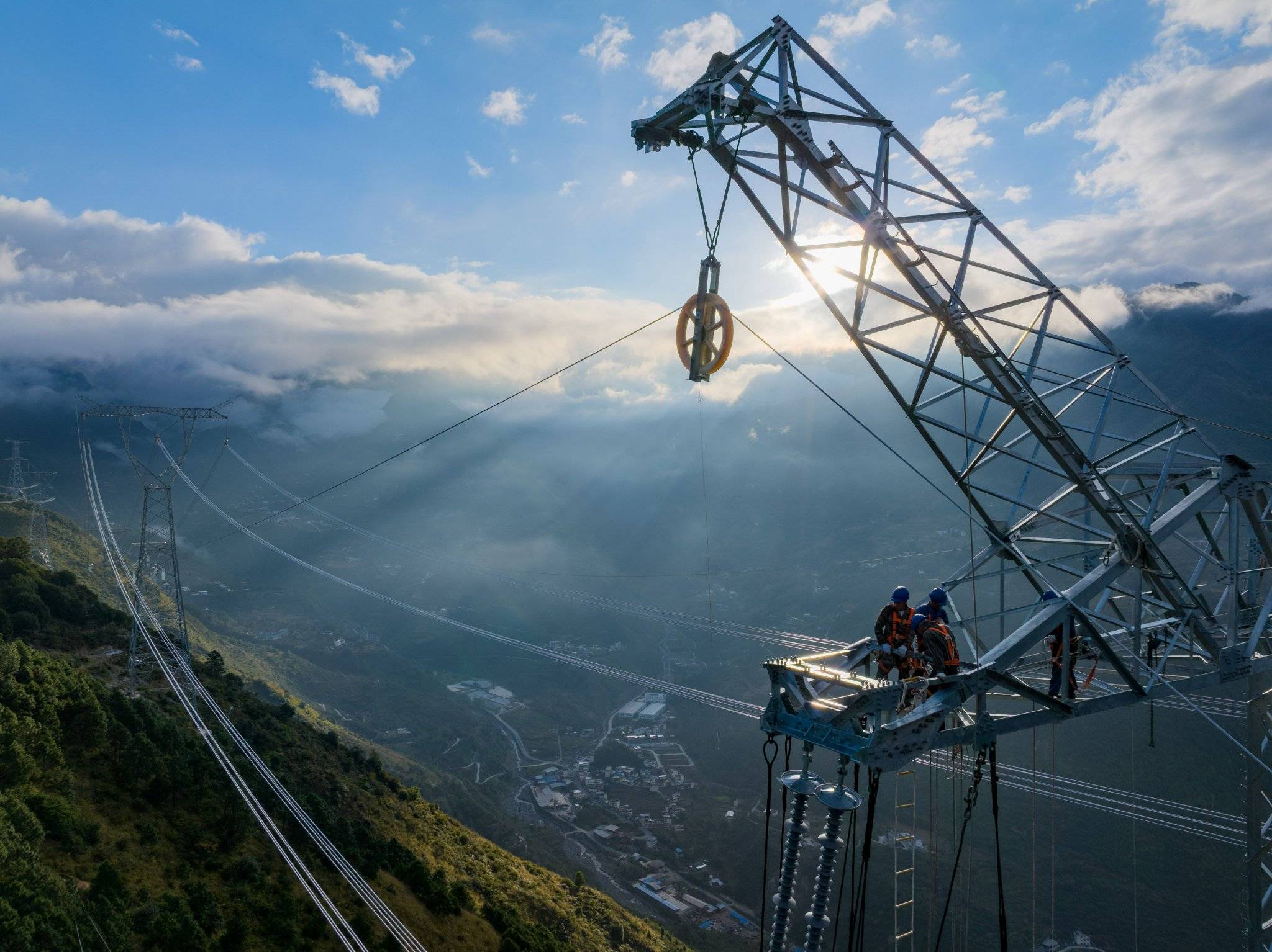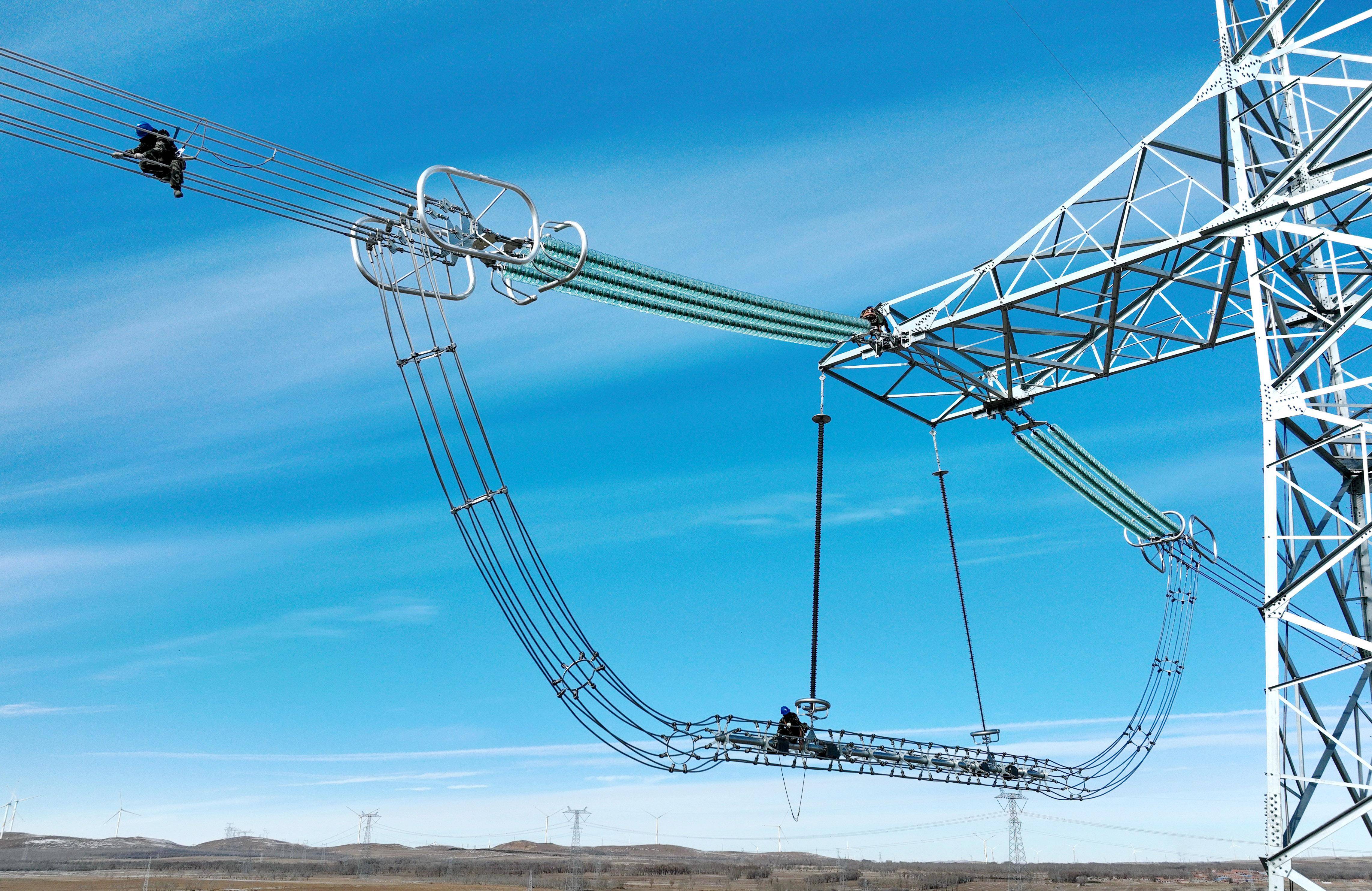 ▲施工人员在国家电网川渝1000千伏特高压交流工程进行收紧导线作业。图/新华社