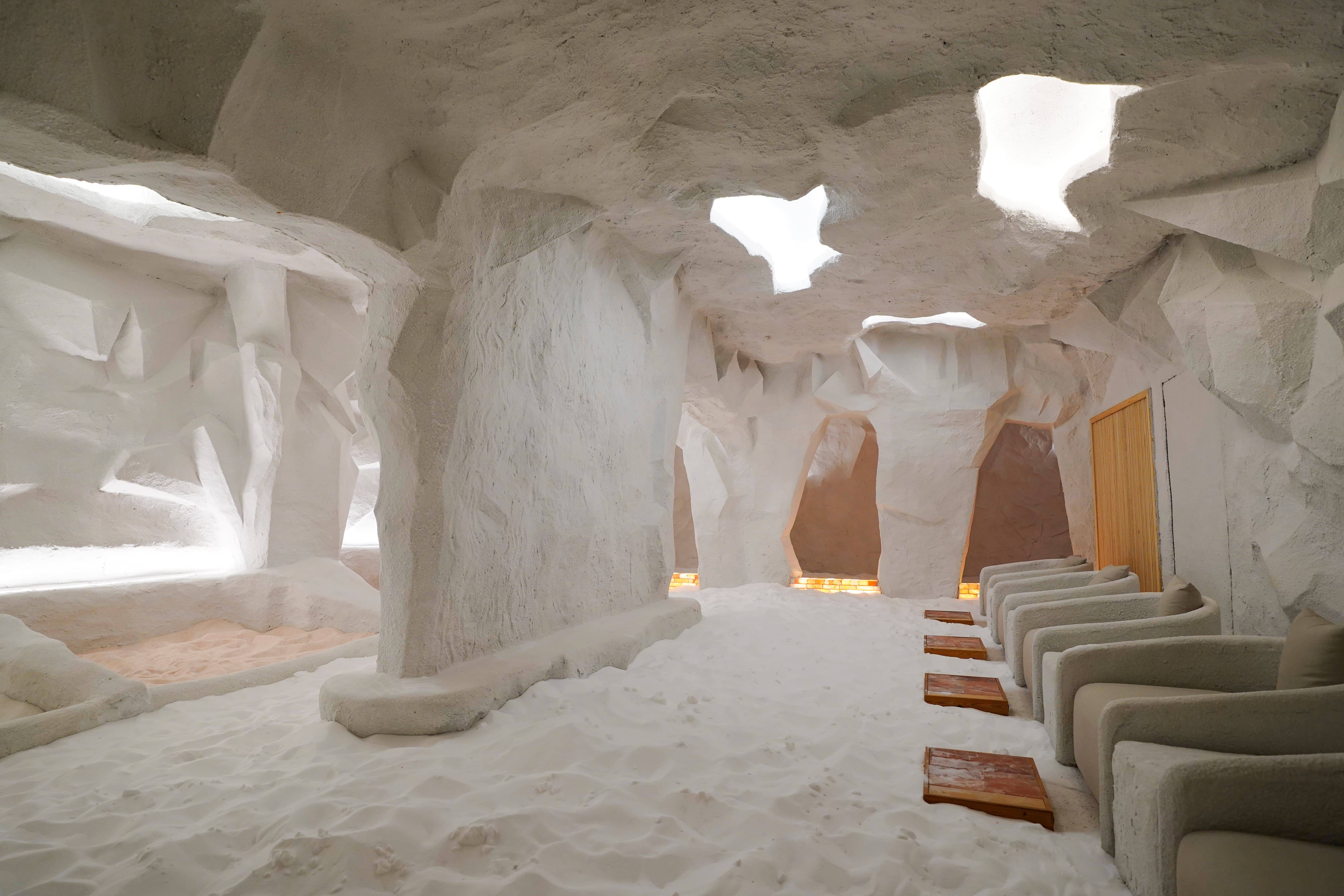 界面新闻在上海五角场的水裹汤泉看到,它的日间团购套餐时长达6小时乃至16小时,过夜套餐时长有14个小时。在这里除了泡汤,仅是桑拿房你就有4种选择,包括盐蒸、芳疗、艾草等。
